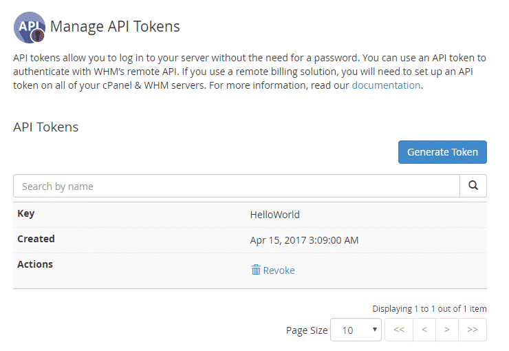 In cPanel & WHM version 64, Manage API Tokens interface is added to WHM. This interface allows to create, revoke, and list API Tokens for cPanel users and third-party developers. API tokens allow third-party developers and cPanel users to run API functions as a WHM account owner via a key hash.