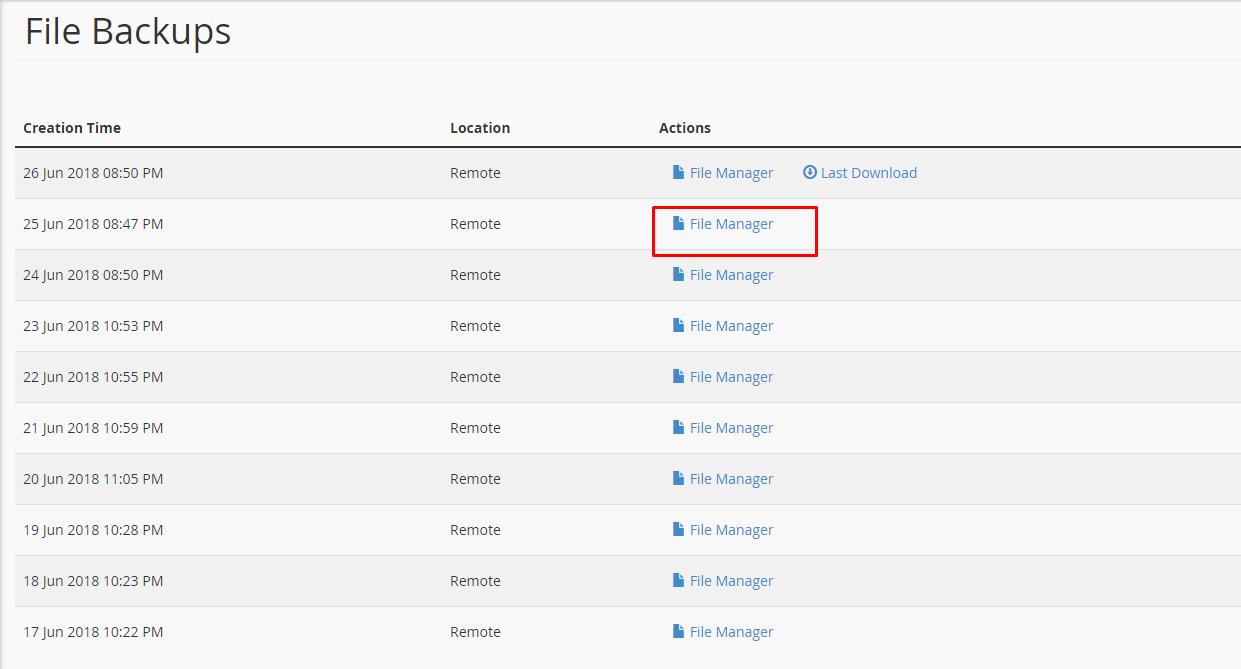 3. Click on the ‘File Manager’ icon next to the date you wish to restore from and select the files, or folders that you wish to restore. To restore your website content select only the public_html folder. The file will generate the right side on the window.